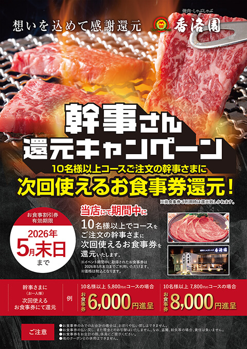 香洛園は想いを込めて感謝還元を合言葉に「幹事さん還元キャンペーン」を開催いたします。